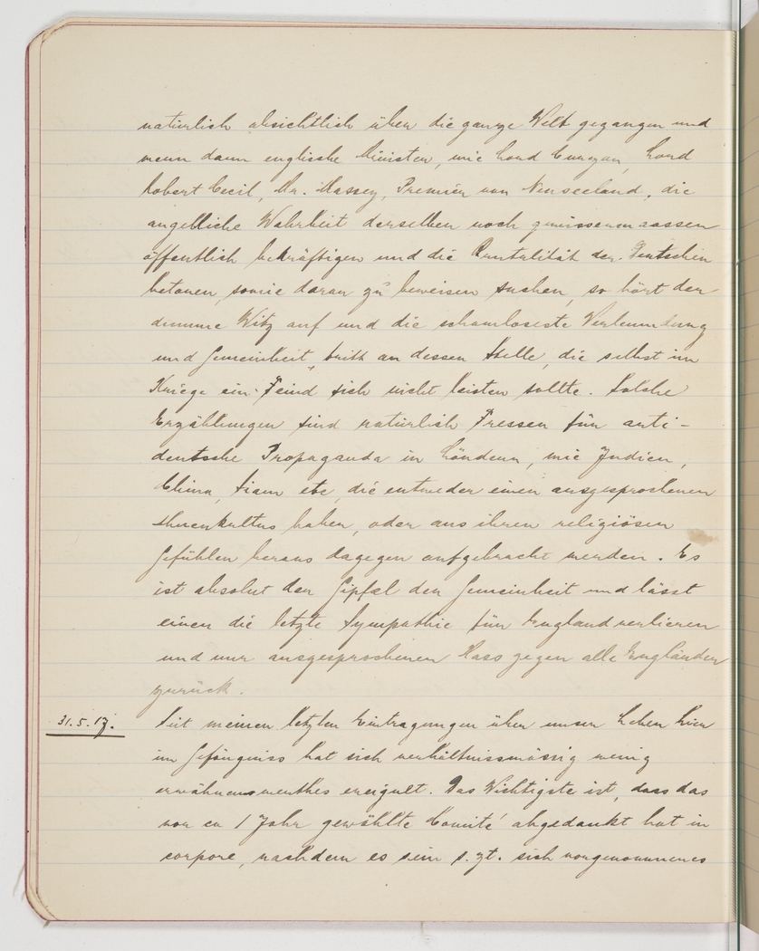 <p>[Page 47]</p><p>was deliberately circulated around the world, of course, but when English government ministers like Lord Curzon and Lord Robert Cecil or the New Zealand Prime Minister, Mr Massey, give credence to it by practically confirming it as an example of German brutality, and even seek to prove it, then the idiotic joke becomes a most blatant and despicable slander that should not be allowed even in wartime. Needless to say, such stories only fuel the anti-German propaganda in countries like India, China, Siam, etc where ancestry worship is particularly pronounced and religious emotions are easily stirred. It is simply the epitome of despicableness, destroying even the last bit of sympathy we may have had for the English and leaving behind nothing but hatred for all Englishmen.</p><p>31/5/17.<br />Since my last notes about life here in camp relatively little has happened. The most important event is the resignation in corpore of the committee that was elected 1 year ago, having carried out its</p>