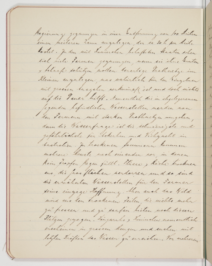 <p>[Page 55]</p><p>the government was forced to erect another fence, about 100 miles away, that costs &pound;30 per mile. In the states afflicted by the rabbit plague many farmers who want to protect their crops and sheep have no choice but to erect their own small version of iron-mesh fences, which for the individual is very expensive and still doesn&rsquo;t really help in the long run. Especially the watering-places in isolated areas are being fenced in with strong iron mesh, because water is the biggest and most precarious problem in Australian farming and stock-breeding. In a dry summer not a drop of rain falls for months on end. Rivers and streams dry up, meadows scorch and the afore-mentioned watering-places are the farmers&rsquo; sole hope. But animals, too, are being drawn to these places when the parched soil no longer yields food and drink. Especially kangaroos and rabbits show up in huge numbers and with their last breath try to reach the water. A few years</p>