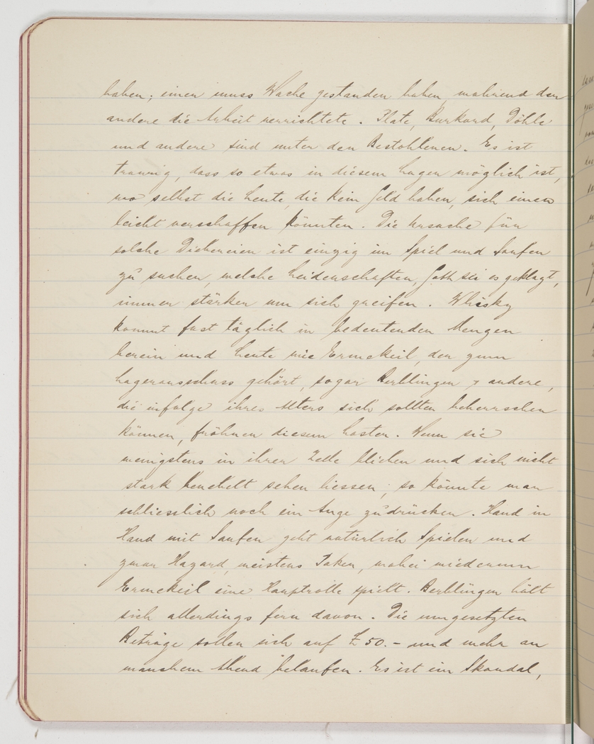 <p>[Page 65]</p><p>one would have stood guard while the other went to work. Among those robbed are Plate, Burkard and Döhle. It’s sad that such things can occur in this camp, where even those without money could easily earn some. Only drinking and gambling can motivate such thievery, and unfortunately, these vices are becoming more and more prevalent. Whisky finds its way into camp almost daily in large amounts, and people like [Ermakeil?], who is a committee member, but even Berblingen and others who should be old enough to show some restraint, indulge this vice. One could maybe turn a blind eye if they stayed in their cells and wouldn’t show themselves all foggy. Hand in hand with the drinking goes the gambling, real gambling no less, like poker, where again Ermakeil plays a leading role. Berblingen at least stays clear of that. The amounts wagered are said to be as high as £50 on any given evening. It’s a scandal</p>