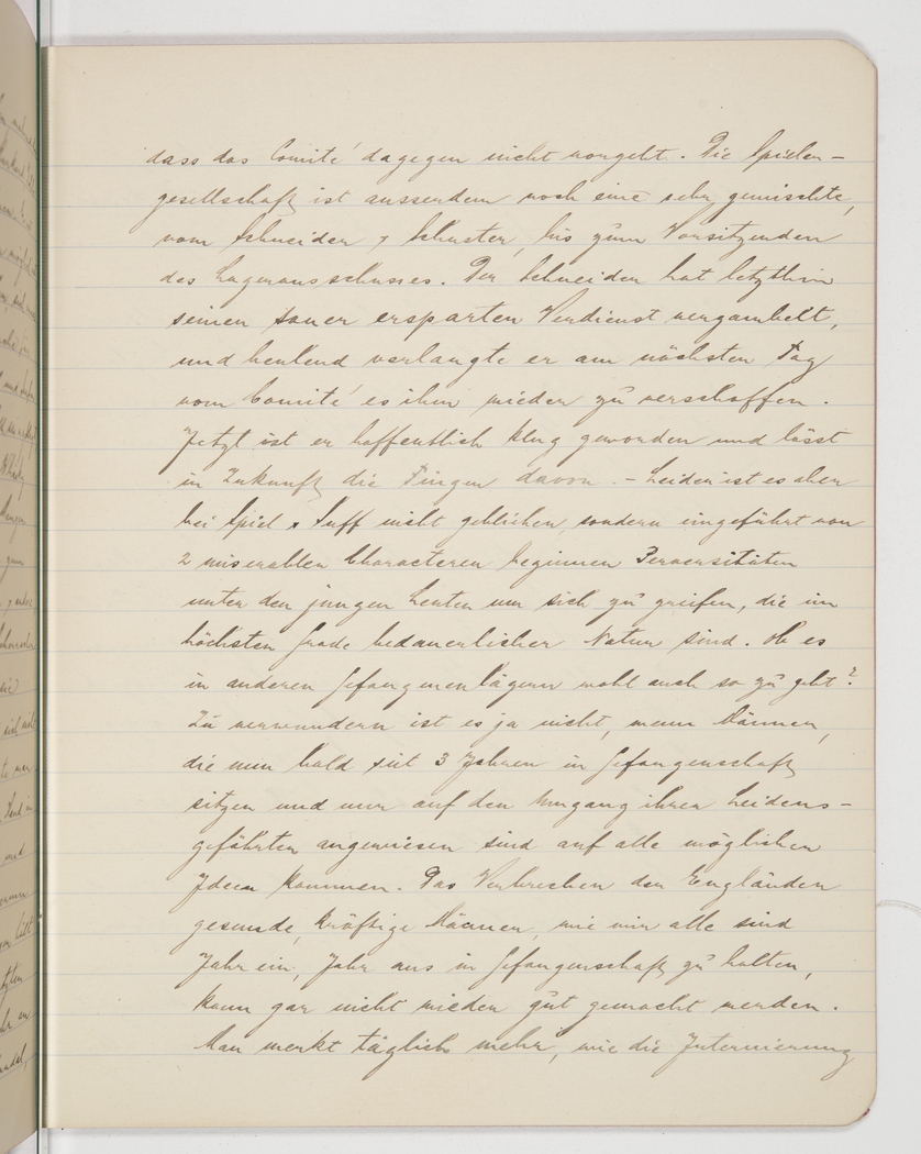 <p>[Page 66]</p><p>that the committee doesn’t do anything against it. The gamblers are a rather mixed lot, from tailor and shoemaker to the chairman of the committee. The tailor recently lost all his hard-won savings and next day demanded, in tears, that the committee reimburse him. Hopefully, he has come to his senses now and will stay away from now on. Unfortunately, gambling and drinking are not even the worst of it, as two low-life characters have now also introduced some highly deplorable perversities among the younger people. I wonder if such things go on in other camps as well? It’s hardly surprising, though, that men who have been in captivity for three years now and are surrounded by nothing but fellow men, would start having the queerest ideas. England’s crime of keeping healthy, robust men as we are in captivity year in, year out, can never be redeemed. Daily one comes to realise just how much internment</p>
