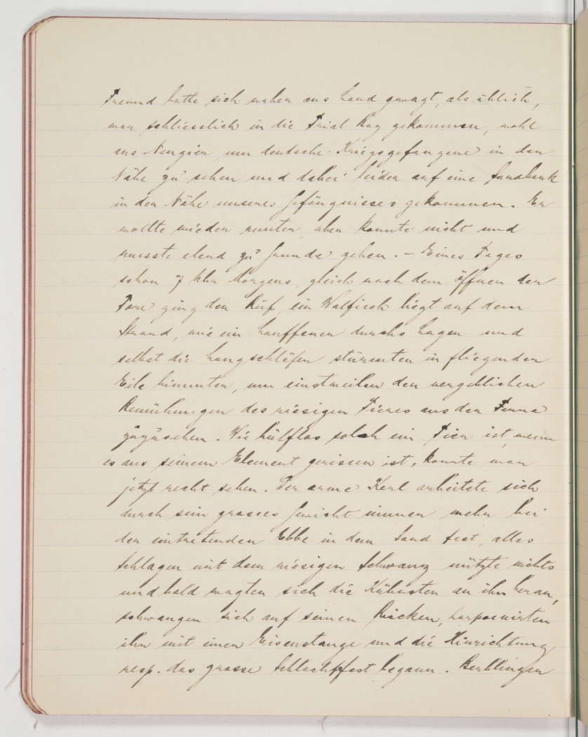 <p>[Page 75]</p><p>friend came closer this time and eventually entered Trial Bay, probably eager to see the German prisoners of war up close, but unfortunately got beached on a sandbank near our prison. He tried to get away but couldn&rsquo;t, and died a slow and terrible death. &nbsp;One day, at 7 o&rsquo;clock in the morning, right after the gates opened, we heard somebody shout that a whale was on the beach and like wildfire the news spread and even the late risers in camp rushed out of their cells and to the beach to observe, from a safe distance, the futile efforts of the great big beast. One could see how helpless such an animal is when taken out of its habitat. The poor guy, trapped in the low tide, tried to break loose by pounding his huge tail, but instead got more and more stuck in the sand, not helped by his enormous weight, and eventually the bolder ones among us dared approach and hopped on his back, where they began to harpoon him with an iron rod, and thus the execution, or rather, the great big slaughter began.&nbsp;Berblingen,</p>