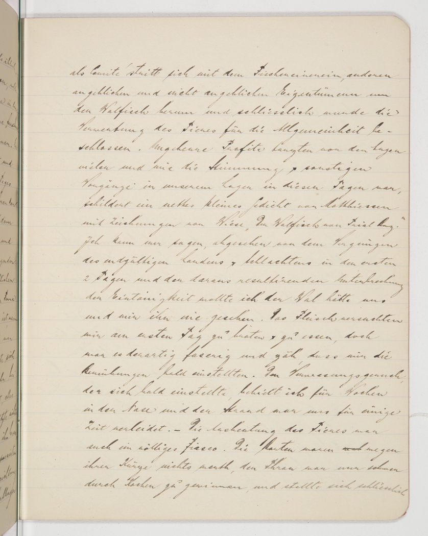 <p>[Page 76]</p><p>as the committee [representative], fought with the fishing society and several other interested parties over the whale, and eventually it was decided that the yields from the animal were to be shared by all. Many began to dream of huge profits, and a nice little poem by Matthiessen, “The Whale of Trial Bay”, with illustrations by Wiese, aptly describes the excitement and other events in the camp during those days. I for my part can only say that apart from the entertainment provided by the eventual landing of the whale and the slaughter, which in the first 2 days brought a welcome break from the camp monotony, I’d rather we hadn’t set eyes on the whale, nor it on us. At first we tried to roast the meat and eat it, but it was so terribly fibrous and tough that we soon abandoned the effort. The foul smell of decomposition that soon followed haunted my nose for several weeks and the beach became quite unattractive for a long while. The yields from the animal were a complete flop, too. The [indecipherable] were too short to be worth anything, and the fish-liver oil proved to be difficult to harvest, we had to boil it but eventually</p>