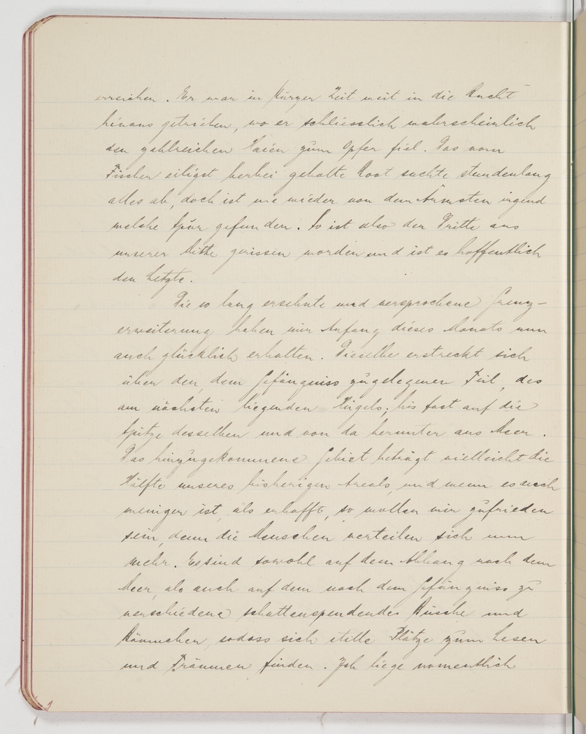 <p>[Page 79]</p><p>anymore. In no time he was way out there and probably fell victim to the many sharks. The fisherman fetched his boat and searched for him for hours, but nobody has ever seen a trace of the poor guy. Thus, a third man has been torn from us, and hopefully the last one.</p><p>The long-promised and much-hoped-for extension of the boundaries has finally happened at the beginning of this month. The grounds now stretch across the facing hill, almost up to the peak, and from there down to the shore. The additional area is probably half as big as the former camp grounds, and although it is less than we had hoped for, we should be grateful because at least people can scatter a bit more. Both on the slope down to the sea and the one facing camp, there are various small trees and bushes that offer shade and plenty of tranquil spots for reading and dreaming. I particularly</p>