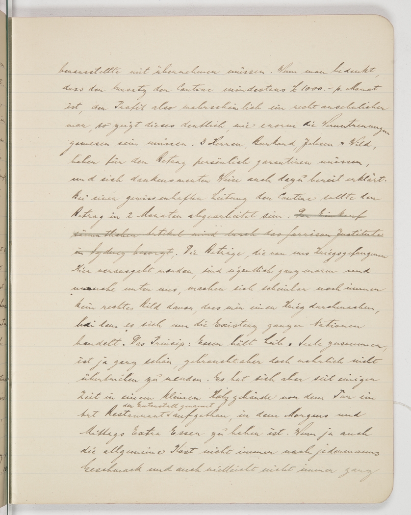 <p>[Page 8]</p><p>when balancing the canteen books. When you consider that the canteen’s turnover is at least £1,000 a month and the profit thus has to be significant, this clearly shows the magnitude of the embezzlements. Three gentlemen – Burkard, Jehsen and Wild – personally had to underwrite the shortfall, and thankfully were prepared to do so. Under good management of the canteen, the amount should be written off within 2 months. The Garrison Institute in Sydney is in charge of purchasing all items. The sums that the prisoners spend here are really quite substantial, and many a one among us still doesn’t fully realise that we are engaged in a war that affects the existence of entire nations. The principle of “food holds together body and soul” may be a worthy concept but doesn’t need to be exaggerated. And yet for some time now we have had a restaurant in a little shack outside the gate, called Duck Coop, where one can get extra food for breakfast or lunch. While the generally available food is not to everybody’s liking and may not always be quite</p>