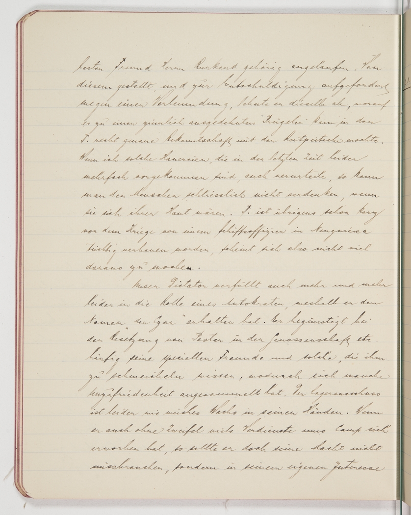 <p>[Page 83]</p><p>best friend, Mr Burkard. Challenged by the latter, who demanded an apology over a slander, he refused, which led to an extensive fight during which T. got thoroughly acquainted with a riding whip. Although I detest such punch-ups, of which regrettably we have more and more nowadays, one cannot hold it against a man who wants to defend himself. T., by the way, copped a thorough beating already before the war, from a naval officer in New Guinea, and doesn’t seem to care much.</p><p>Our dictator also seems to turn more and more into an autocrat, which earned him the moniker “The Tsar”. When filling positions in the commission, he seems to pick his special mates and those willing to flatter him, which has caused quite some dissatisfaction. The presiding committee, unfortunately, is like putty in his hands. Even though there is no denying his many achievements on behalf of the camp, he should not abuse his power, but for his own good</p>