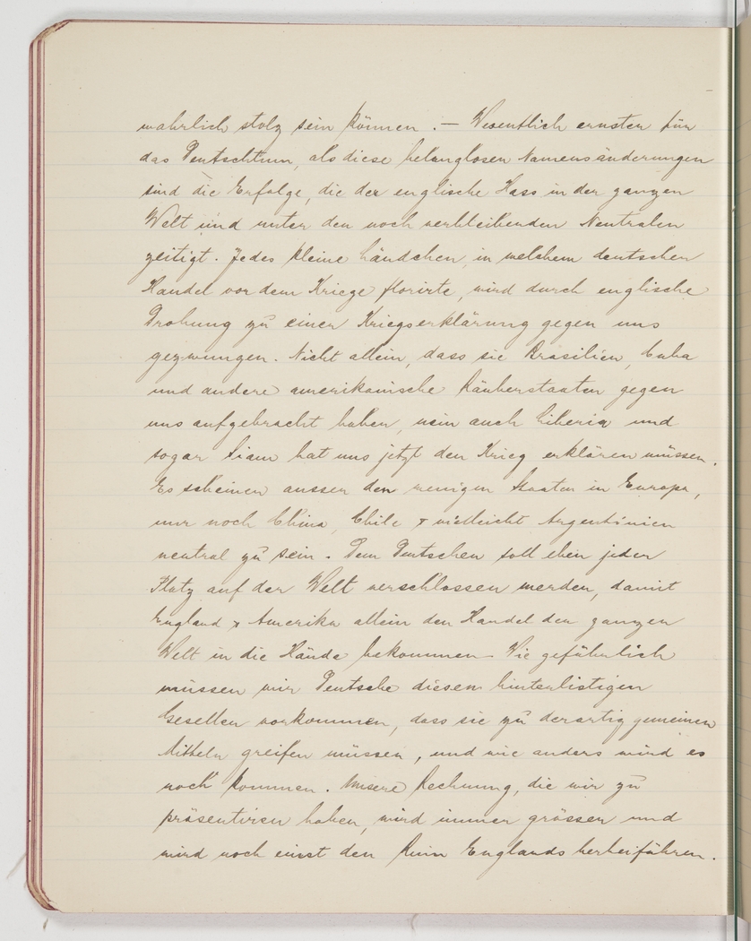 <p>[Page 85]</p><p>no doubt will revere. But much more consequential for the German people than these trivial name changes is the fact that the English hatred is so pervasive in the rest of the world and among the few remaining neutral nations. Every little country where German commerce was thriving before the war has been cowed by the British into declaring war on us. Not enough that they have turned Brazil, Cuba and all the other American pirate nations against us, now also Liberia and even Siam had to declare war on us. Apart from a few European nations, only China, Chile and maybe Argentina seem to remain neutral. The Germans have to be locked out of every place in this world so that England and America can monopolise world trade. How dangerous Germany must appear to this pack that they have to resort to such vile methods, and how wrong we will yet prove them. The bill we will present is growing by the day and will eventually drive England into bankruptcy.</p>