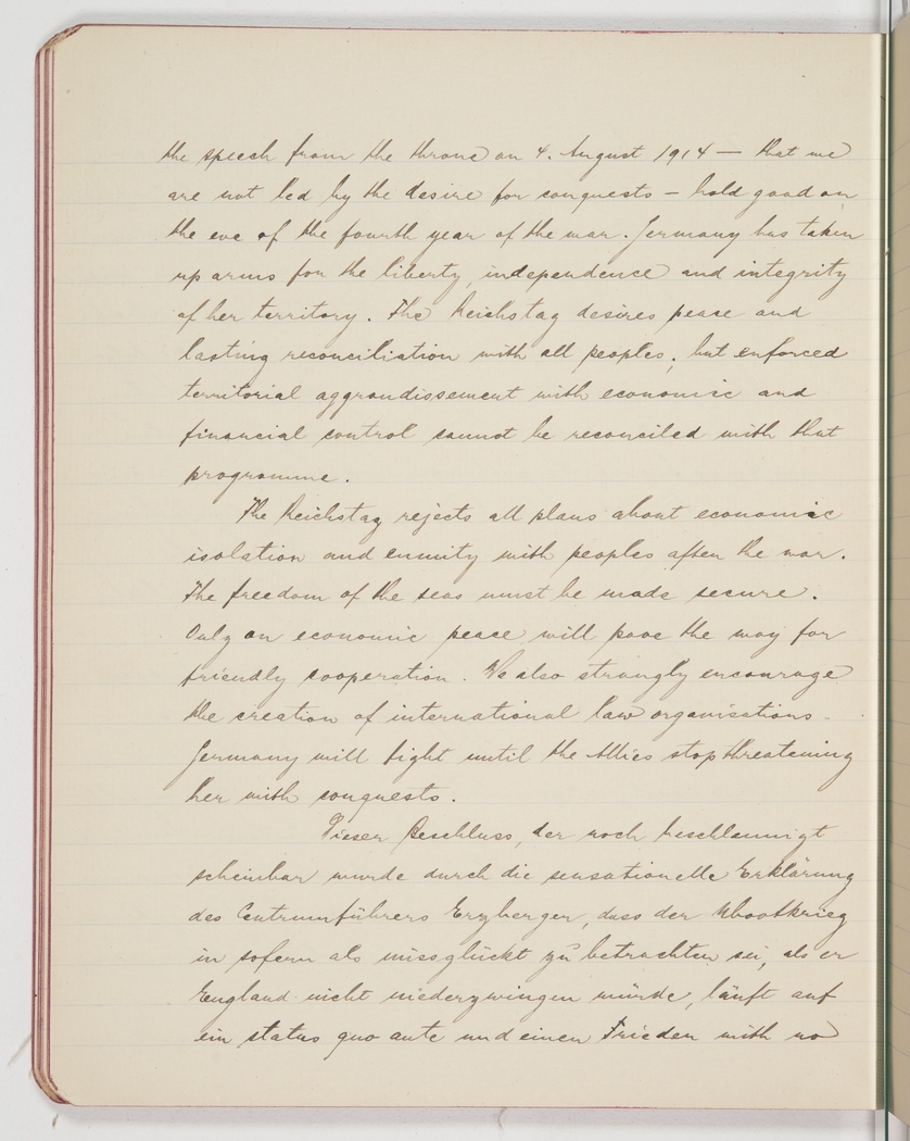 <p>[Page 87]</p><p>the speech from the throne on 4th of August 1914 – that we are not led by the desire for conquests – hold good on the eve of the fourth year of the war. Germany has taken up arms for the liberty, independence and integrity of her territory. The Reichstag desires peace and lasting reconciliation with all peoples; but enforced territorial aggrandisement with economic and financial control cannot be reconciled with that programme.</p><p>The Reichstag rejects all plans about economic isolation and enmity with peoples after the war. The freedom of the seas must be made secure. Only an economic peace will pave the way for friendly cooperation. We also strongly encourage the creation of international law organisations. Germany will fight until the Allies stop threatening her with conquests. [end English original]</p><p>This resolution, seemingly accelerated by the sensational statement of centrist leader Erzberger that the U-boat war had to be viewed as unsuccessful in so far as it did not force England to her knees, amounts to a status quo ante and a peace with no</p>