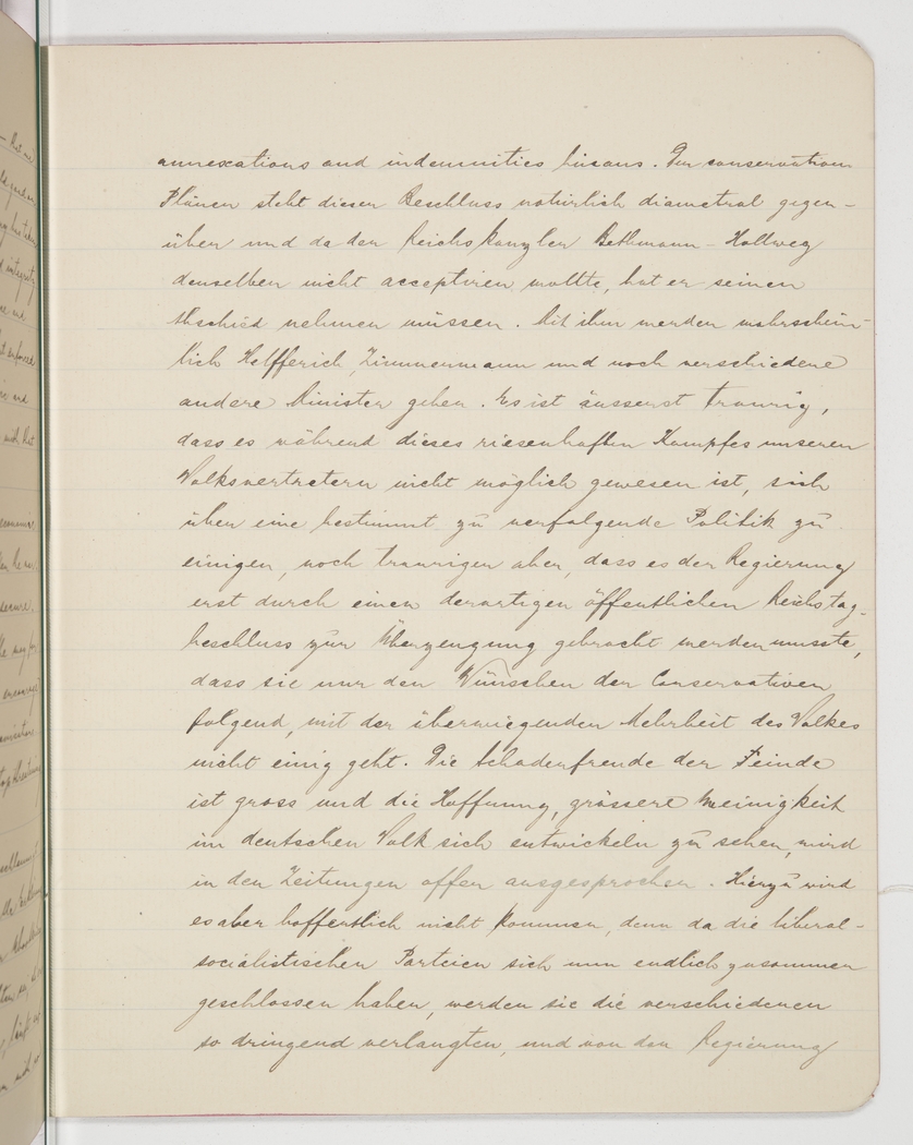 <p>[Page 88]</p><p>annexations and indemnities. Of course, this resolution diametrically opposes the conservatives’ plans and because Reich Chancellor Bethmann-Hollweg did not want to accept it, he has had to resign. No doubt he’ll be followed by Helfferich, Zimmermann and a few other ministers. It is very sad that this colossal tug-of-war between the representatives of the people did not generate an accord on a coherent policy, but it is sadder still that the government had to be convinced with such a public Reichstag resolution that, by obliging only the wishes of the conservatives, it ignored the overwhelming majority of the people. The enemy is gloating, and the newspapers openly discuss the hopes that the disagreement among the German people might grow even deeper. Hopefully, however, it won’t come to this because now that the liberal and socialist parties have finally united, they will be able to force through the oft-demanded and</p>