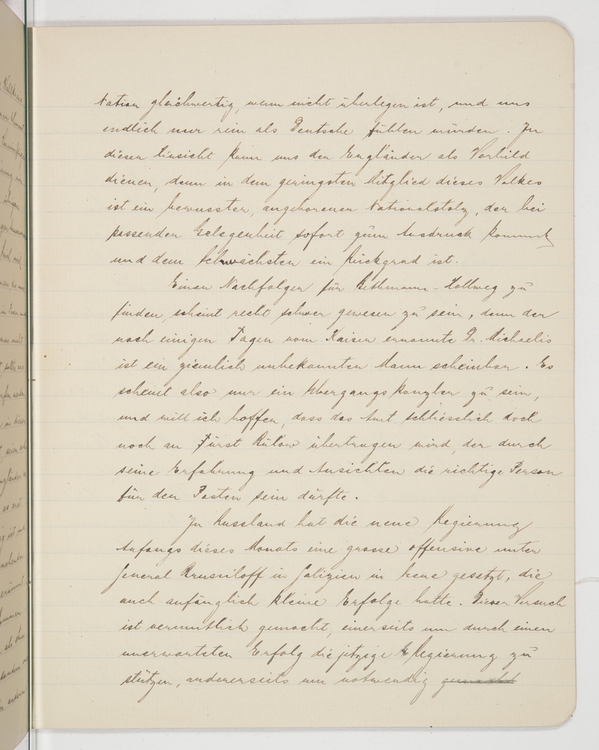 <p>[Page 90]</p><p>equal to other nations, if not superior, and should be happy to feel purely German. In this respect, the English should be our model as even the lowest of their citizens has an innate national pride that manifests itself at various occasions and props up the weakest among them.</p><p>It seems to have been difficult to find a successor to Bethmann-Hollweg because the man appointed by the Kaiser a few days ago, Dr Michaelis, appears to be fairly unknown. It may just be a transitional chancellor, and I hope that the office will eventually be given to Prince Bülow, who with his experience and opinions would be the right person for it.</p><p>In Russia, at the beginning of this month, the new government has staged a new offensive in Galicia, led by General Brusiloff, at first with some success. This was probably done in order to prop up the new government with an unexpected triumph, but also to extort much-needed</p>