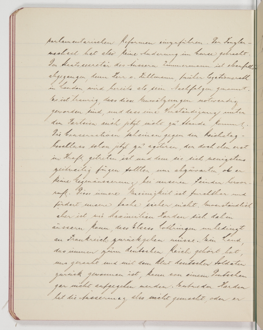 <p>[Page 95]</p><p>introducing the much-demanded parliamentary reforms. The change of Chancellor has not brought about a change of course. The Foreign Affairs Minister, Zimmermann, has also left, and Mr von Kühlmann, formerly ambassadorial counsel in London, has been touted as his successor. It is sad that all the changes have become necessary and that even now an agreement between the parties proves elusive. The conservatives seem to agitate against the Reichstag resolution, which has only just been passed and which they should respect at least for the time being, to see if it elicits a reaction from the enemy. This internal strife is terrible and certainly won’t help our cause. Incomprehensible, however, that Maximilian Harden comes out saying that Alsace Lothringen has to be returned to France. A German cannot possibly give up a region that has always belonged to the German Empire, was stolen from us and then recaptured with the blood of German soldiers. Either Harden has not made that statement, or he</p>