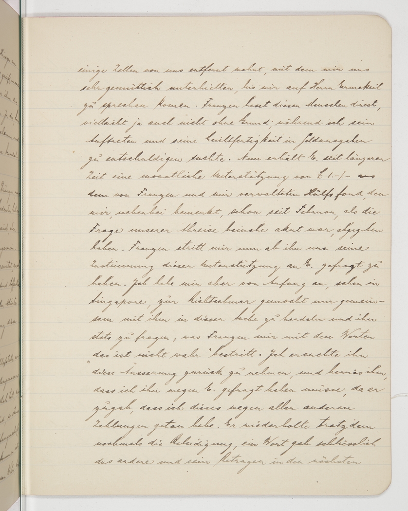 <p>[Page 98]</p><p>lives a few cells down, and we were chatting quite amenably until the talk turned to Mr Ermakeil. Franzen really hates this guy, and maybe he has good reason; while I sought to make excuses for his demeanour and his carelessness in money matters. The fact is that for some time now, E. has been getting a monthly subsidy of £1 from the relief fund that Franzen and I had been holding in trust but which, by the way, we had passed on in February, when we thought our release was imminent. Franzen now denied that I had asked him for his approval of the subsidy for E. But from the beginning, in Singapore already, I had made it my rule to always act in concert with him, which Franzen flatly denied with the words “that’s not true”. I asked him to take it back, trying to convince him that I had surely consulted him about E. since I had always consulted him on any other payment, which he admitted I did. Yet he repeated his insult, one word led to another, and his behaviour in the next</p>