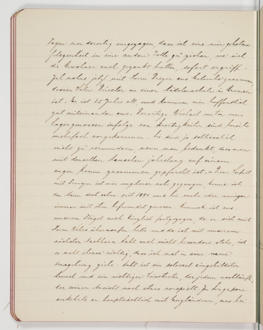 <p>[Page 99]</p><p>few days became so unbearable that I seized an opportunity to move to another cell, whose inmates had also fallen out. I now cohabit with Mr Dreyer from Colombo, whose father is the director of a girls&rsquo; school in Bremen. He is 35 years old, and hopefully we get on alright. There have been quite a few changes of this kind due to disagreements among the camp mates. It&rsquo;s not surprising anyway if you think how for years we are forced to huddle together in such cramped quarters. &nbsp;This incident with Franzen has deeply affected me as we&rsquo;ve known each other since 1894 and have always been fairly close. Brennecke, too, recently moved out of our wing after falling out with Mr Wehrs, and since I don&rsquo;t particularly like our next-door neighbour, Suhl, it&rsquo;s probably just as well to move into another environment. Suhl is immensely conceited and also a veritable pussy-footer who will pursue anybody who in his opinion pretends to be something he isn&rsquo;t. In Singapore he associated mainly with English people, which</p>