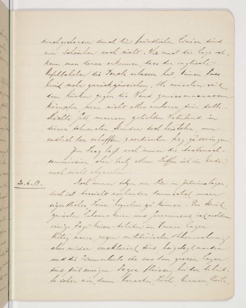 <p>[Page 100]</p><p>it seems we have not managed to break through the enemy lines. How serious things are can be seen from the order by the English command not to retreat one inch. The troops are told to fight with their backs against the wall, so to speak, to avoid defeat. May God assist our beloved homeland in its most difficult hour to achieve the long-aspired and much-deserved victory. The prisoner-exchange commission is still negotiating in The Hague, but despite all hopes there is no end in sight.</p><p>20th/6/18.<br />We&#39;re still stuck in the interim camp but it looks like we shall soon move into our proper &quot;home&quot;. After unionised labourers worked in the new camp for a few days but were ordered off again to ensure military surveillance [?], the dispute between trade unions and government has been settled, and for the last few days carpenters, etc from the main camp have been at work. And so we can watch them erect barracks, canteen, showers, lavatories,</p>