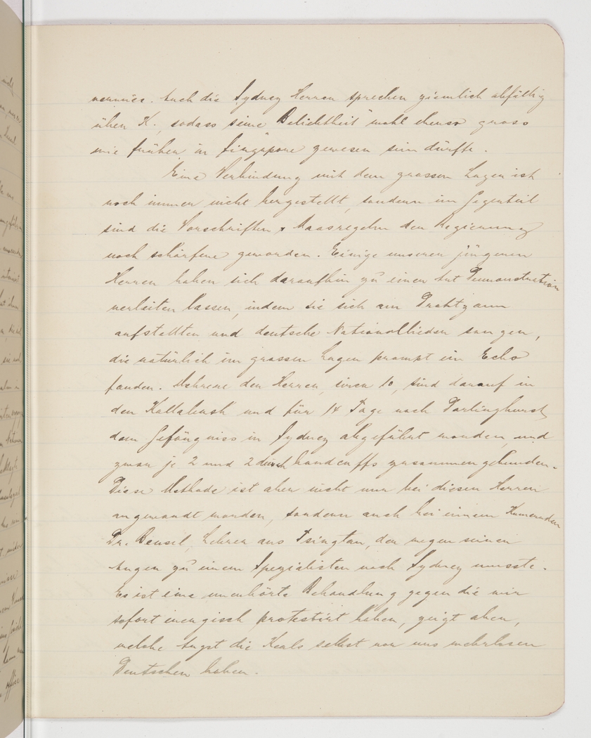 <p>[Page 104]</p><p>the door. The gentlemen from Sydney also have few good words about K., so it looks like his "popularity" here was about as bad as earlier in Singapore. There is still no connection to the main camp, on the contrary, government orders and rules have become more stringent. Some of our younger men were rash enough to stage some sort of demonstration by lining up along the fence and singing German hymns, which were instantly echoed in the big camp. Several of the men, about 10, were thrown into the Kallabush and then taken to Darlinghurst, the prison in Sydney, for 14 days; 2 at a time were handcuffed together. This method was not only applied to these men, but also to one of our comrades, Dr Beusel, a teacher from Tsingtao who had to go to Sydney to see an eye specialist. It is a shocking treatment and we immediately put in a vigorous protest, but it shows how afraid these goons are even of defenceless Germans.</p>