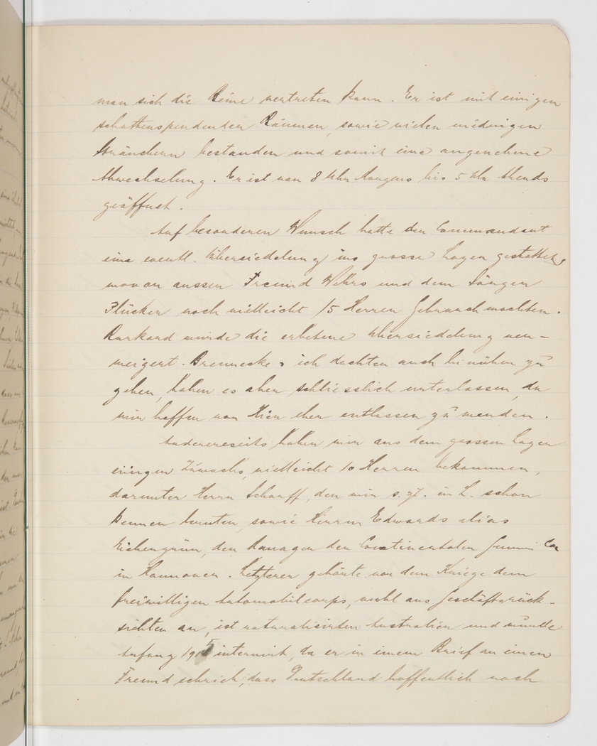 <p>[Page 108]</p><p>can stretch one&#39;s legs. There are a few shady trees and many shrubs and bushes, which makes for a nice change. The area is open from 8 am to 5 pm.</p><p>Upon special request, the Commander has allowed transfers into the main camp, and apart from our friend Wehrs and the singer Pl&uuml;cker, some 15 gentlemen have taken him up on this. But Burkard was denied a transfer. Brennecke and I also toyed with the idea, but decided against it, as we hope to get a quicker release from here.</p><p>In exchange, we got some additions from the main camp, probably about 10 men, among them Mr Scharff, whom we got to know the first time in Liverpool, and Mr Edwards alias Eichengr&uuml;n, the manager of Continentale Gummi Co. in Hannover. The latter, a naturalised Australian, was a member of the volunteer automobile corps before the war, probably for business reasons, and was interned early in 1915, because he wrote in a letter to a friend that Germany &quot;hopefully</p>