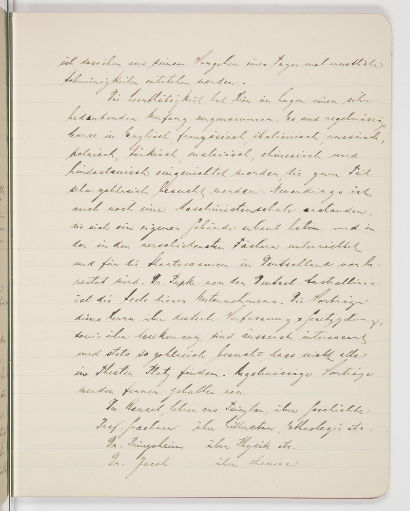 <p>[Page 14]</p><p>that his attitude will one day cause him a lot of trouble.</p><p>Teaching activities here in camp have developed enormously. There are regular language courses in English, French, Italian, Russian, Polish, Turkish, Malay, Chinese and Hindustan, some of them very well attended. Lately, they've also started an engineering school for which they erected its own building, where they teach various classes and even prepare for the final exams in Germany. Dr Pupke of the Deutsch- Australlinie [German-Australian shipping line] is the soul of this enterprise. His lectures about the German constitution and law, and about insurance, are very interesting and always so well attended that the theatre can't accommodate them all. There are also regular lectures by Dr Beusel [Bausel?], a teacher from Tsingtao, on history; Prof Graehner on literature, ethnology, etc; Dr Pringsheim on physics, etc; Dr Jacob on chemistry;</p>