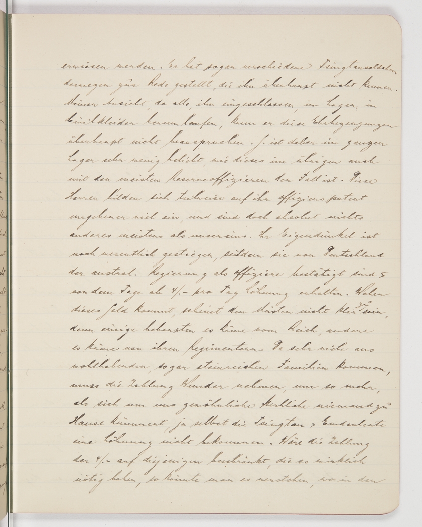 <p>[Page 16]</p><p>He has even remonstrated with the Tsingtao soldiers, who don't even know him. In my opinion, he has no reason to demand salutes since everybody, him included, runs around in civilian clothes. G. is therefore disliked throughout the camp, which is the case with most reserve officers. These gentlemen are very stuck-up about their officer's brevet and yet they're not all that different from the rest of us. Their arrogance increased even more when the Reich confirmed their officer's status to the Australian government and they began getting a £4 daily pay. Most of them don't seem to know where that pay comes from; some claim it's from the Reich, others say it's from their regiments. Since a lot of them hail from wealthy and even super-rich families, the pay makes you wonder, more so considering that nobody at home gives a damn about us mere mortals, and not even the Tsingtao and Emden people are getting a pay. One could understand if the £4 subsidy were limited to those really in need, but given</p>