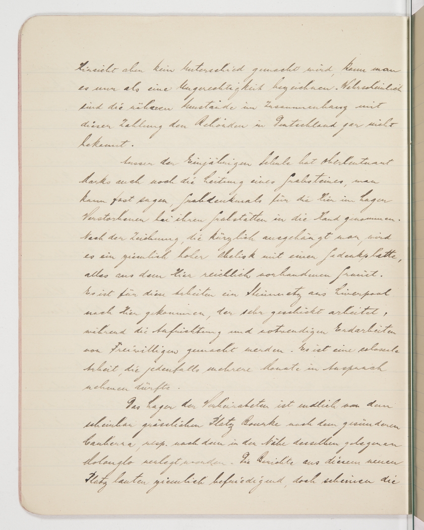 <p>[Page 17]</p><p>that absolutely no difference is being made in that regard, one can only label it an injustice. Most likely the authorities in Germany aren't even familiar with the details of these payments. Apart from his special school, Lieutenant Marks has also begun to organise a tombstone - one could almost say, a memorial - for those who died in camp. To judge from a drawing that was recently displayed, it is to be a rather tall obelisk with a plaque, all made from the granite that is so abundant here. He had a stonemason come up from Liverpool who is very good at it, while scaffolding and the necessary spadework are done by volunteers. It's an enormous endeavour that should take several months to complete. The camp of the married couples has finally been transferred from the insalubrious Bourke to the much healthier Canberra, that is, to the nearby Molonglo. The reports from the new place are pretty satisfactory, but it seems</p>
