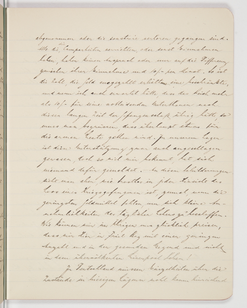 <p>[Page 20]</p><p>confiscated upon internment or were otherwise lost. All those who work in the camp or have other sources of income, cannot apply, or only for the difference in their income to the 10/.- per month. Therefore, only a very limited number of internees get the subsidy, and while I would have expected the Reich to shell out a bit more than the 10/.- per month for its needy subjects after such a long time in captivity, it's good to see that something is being done at last. In our camp, the [application details for the] subsidy were also posted on the noticeboard, but as far as I know, nobody stepped forward. - But it becomes clear from these accounts how desolate the fate of a prisoner of war is, especially when there is no money for even the smallest of amenities to ease the daily grind. And how we should appreciate that we are here in Trial Bay, among fewer people and in a healthier region, and don't have to live in the overcrowded Liverpool!</p><p>It seems that back in Germany they have no real knowledge of the conditions in Australian camps, or at least no proper</p>