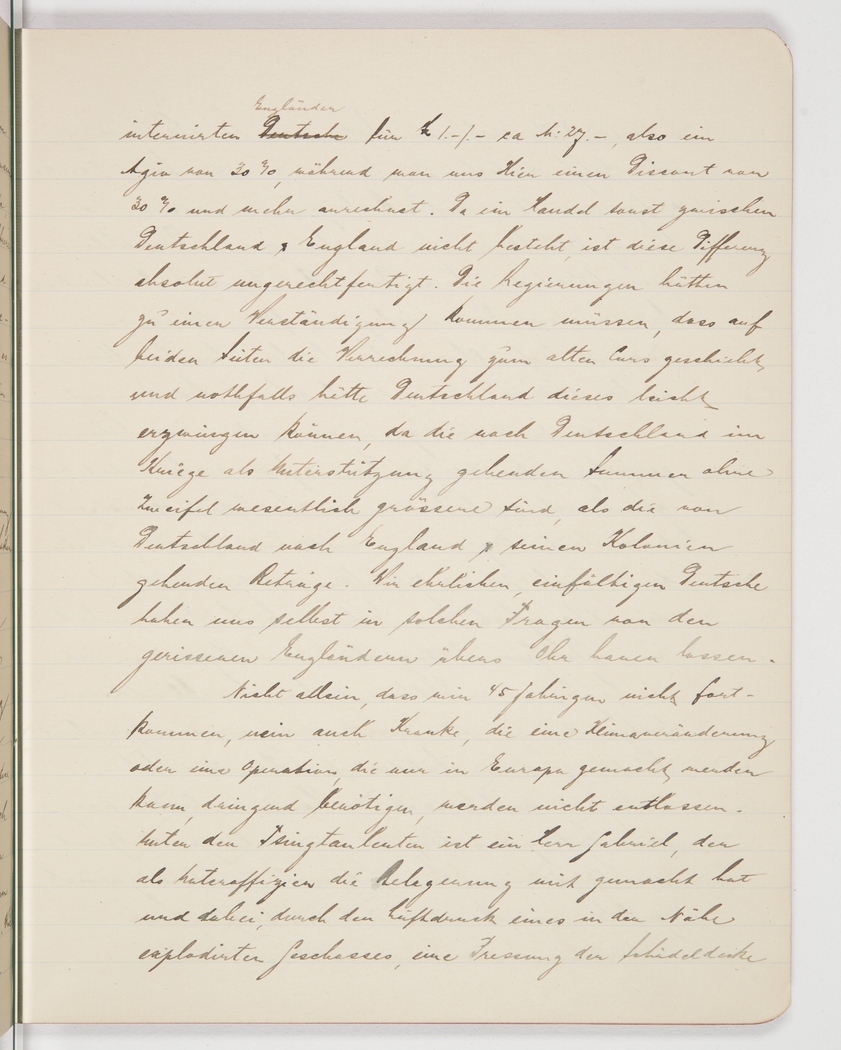 <p>[Page 22]</p><p>Ruhleben, etc receive about 27 Mark for £1, which is a premium of 30%, whereas here they charge us a discount of 30% and more. Since there is no other trade between Germany and England, this differential is not justified. The governments should have reached an agreement to convert on both sides at the old exchange rate, and Germany should have been able to force the issue since the amount of money that flows as aid into wartime Germany is surely a lot higher than the amounts that flow from Germany into England and its colonies. Even in these matters we upright and naive Germans have let the English put one over us.</p><p>Not only we 45-year-olds can't get away from here, even the sick who desperately need a climate change or a type of surgery that is only available in Europe won't be released. Among the Tsingtao people there is a Mr Gabriel who participated in the siege as a corporal and whose cranium was dented inward on one side by the</p>