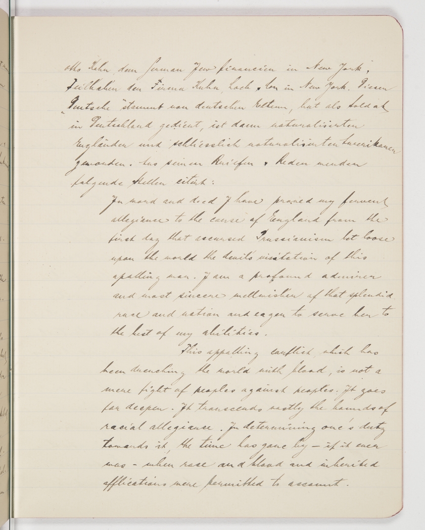 <p>[Page 34]</p><p>Otto Kahn, the German Jewish financier in New York, a partner in the firm Kuhn, Loeb &amp; Co in New York. This &quot;German&quot; has German parents, has served as a soldier in Germany, was then naturalised in England and later in America. The following passages from his letters and speeches were cited:</p><p>[In&nbsp;English in image.]<br />In word and deed I have proved my fervent allegiance to the cause of England from the first day that accursed Prussianism let loose upon the world the devil&#39;s visitation of this apalling war. I am a profound admirer and most sincere wellwisher&nbsp;of that splendid race and nation and eager to serve her to the best of my abilities.</p><p>This appalling conflict, which has been drenching the world with blood, is not a mere fight of peoples against peoples. It goes far deeper. It transcends vastly the bounds of racial allegiance. In determining one&#39;s duty towards it, the time has gone by -&nbsp;if it ever was -&nbsp;when race and blood and inherited afflications&nbsp;were permitted to account. [end of English]</p>