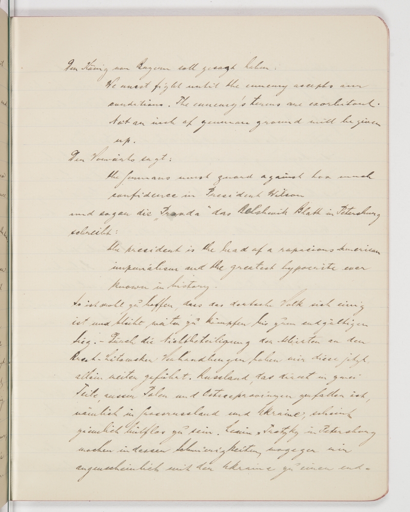 <p>[Page 40]</p><p>The King of Bavaria is said to have said:</p><p>[In English]<br />We must fight until the ennemy [enemy] accepts our conditions. The ennemy's terms are exorbitant. Not an inch of German ground will be given up.</p><p>The Vorwärts [official publication of the German Social Democrats] said: <br />The Germans must guard against too much confidence in President Wilson - and even the Pravda, the Bolshevik mouthpiece in St Petersburg, writes: "The president is the head of a rapacious American imperialism and the greatest hypocrite ever known in history".<br />[end of English quotes]</p><p>Thus, we can hope that the German people think in unison and are willing to continue fighting until the decisive victory. Since the Allies did not participate in the Brest-Litovsk negotiations, we have continued alone. Russia, which has split into two parts, apart from Poland and the Baltic provinces - namely, Greater Russia and Ukraine - seems to be pretty helpless. But Lenin & Trotsky in St Petersburg are playing tough, so it appears that we came to a separate agreement</p>