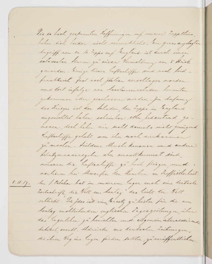 <p>[Page 5]</p><p>Unfortunately, the high hopes we had for our Zeppelins have not come true. A large-scale attack on England with about 10 Zepps was thwarted by a colossal storm, resulting in the destruction of 5 of them. Some of these airships were blown all the way to southern France and even into Italy, where they were either downed by engine problems or enemy fire. They say that at the beginning of the war the Zepps inflicted quite a bit of damage on England, but it seems we didn't have enough of the airships at that stage to cause real havoc. Now that anti-aircraft cannons and other protective measures have been perfected, the airships have to fly too high and thus lose accuracy of aim when dropping the bombs.</p><p>5th/11/17.<br />On 1st of October, a German newspaper, the "World on Monday", saw the light of day here in camp. The idea is to fill the gap since the English daily newspapers don't come out on Monday, and to report events in camp and other interesting developments, maybe even reprint some articles from the German newspapers that find their way into camp.</p>