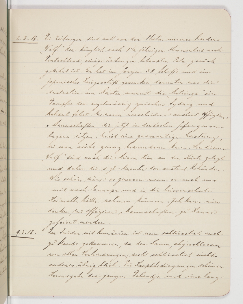 <p>[Page 54]</p><p>2nd/3/18.<br />The newspapers are full of reports about the feats of our raider "Wolf", which recently returned to Germany (some claim, to Pola) after a 1½-year absence. It has sunk 38 ships and a Japanese warship among them, and this really rankles with the Australians, the "Ratunga", a steamship that regularly commuted between Sydney and Rabaul. Various Australian officers and crews are now in German prison camps. It's a truly remarkable feat and we can only admire it. It was the same "Wolf" that laid the mines along the coast here and that explains the disquiet of the Australian government at the time. How great it would have been if it had been able to take us back to Europe and to the sorely missed homeland. I can imagine how its officers and crews are being celebrated.</p><p>9th/3/18.<br />Peace with Romania has now been achieved after all, as the gentlemen, cut off from all connections, had little choice. The main conditions seem to be the restitution of the whole Dobrudja [region] and a long-</p>