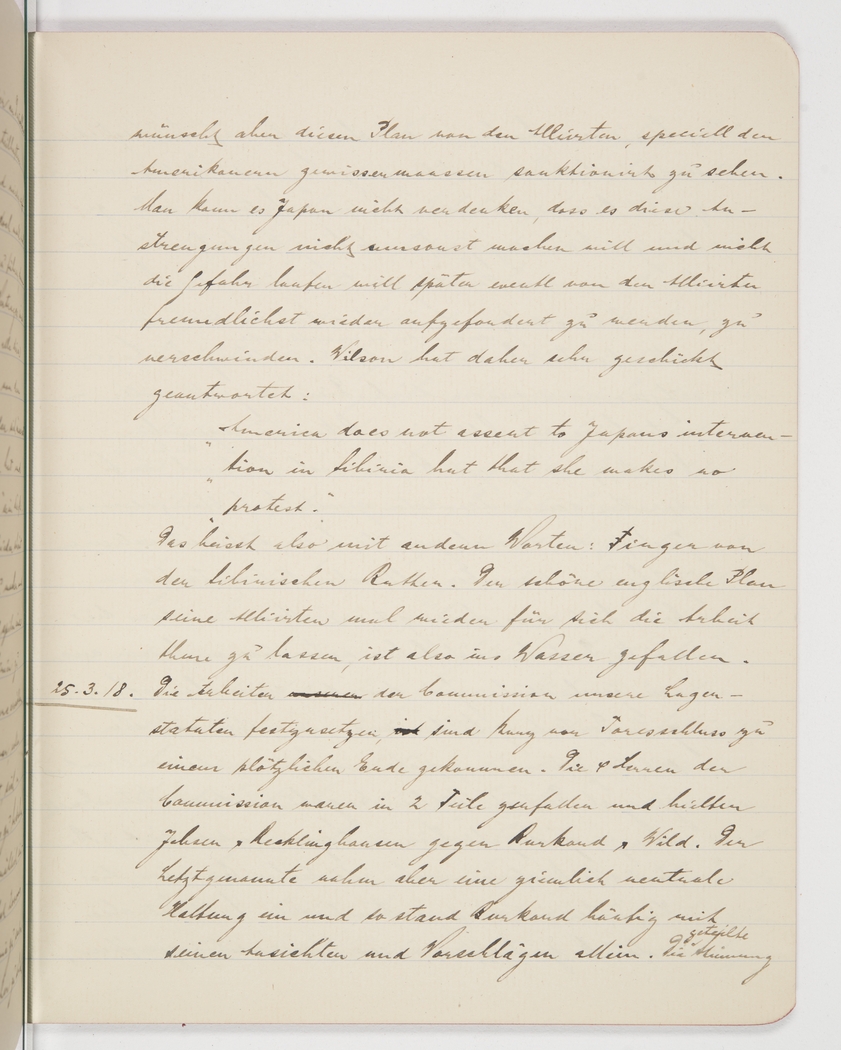 <p>[Page 56]</p><p>but would like to see this plan sanctioned by the Allies, especially by the Americans. You can&#39;t blame the Japanese for not wanting to undertake this huge effort just like that and run the risk of being told eventually by the Allies to pack up and leave. Wilson has therefore replied quite cleverly: [original English quote] &quot;America does not assent to Japans intervention in Sibiria [Siberia] but that she makes no &quot;protest&quot;.&quot; [end English quote]</p><p>In other words: hands off Siberia. England&#39;s cosy plan to have once again an Ally do her dirty work for her has thus been thwarted.</p><p>25th/3/18.<br />The commission&#39;s work on defining a set of camp rules has come to an abrupt halt at the 11th hour. The 4 gentlemen split into 2 parts, Jehsen and Recklinghausen against Burkard and Wild. The last-mentioned, however, was more or less neutral and Burkard therefore found himself often alone with his opinions and suggestions. The split among the commission members</p>