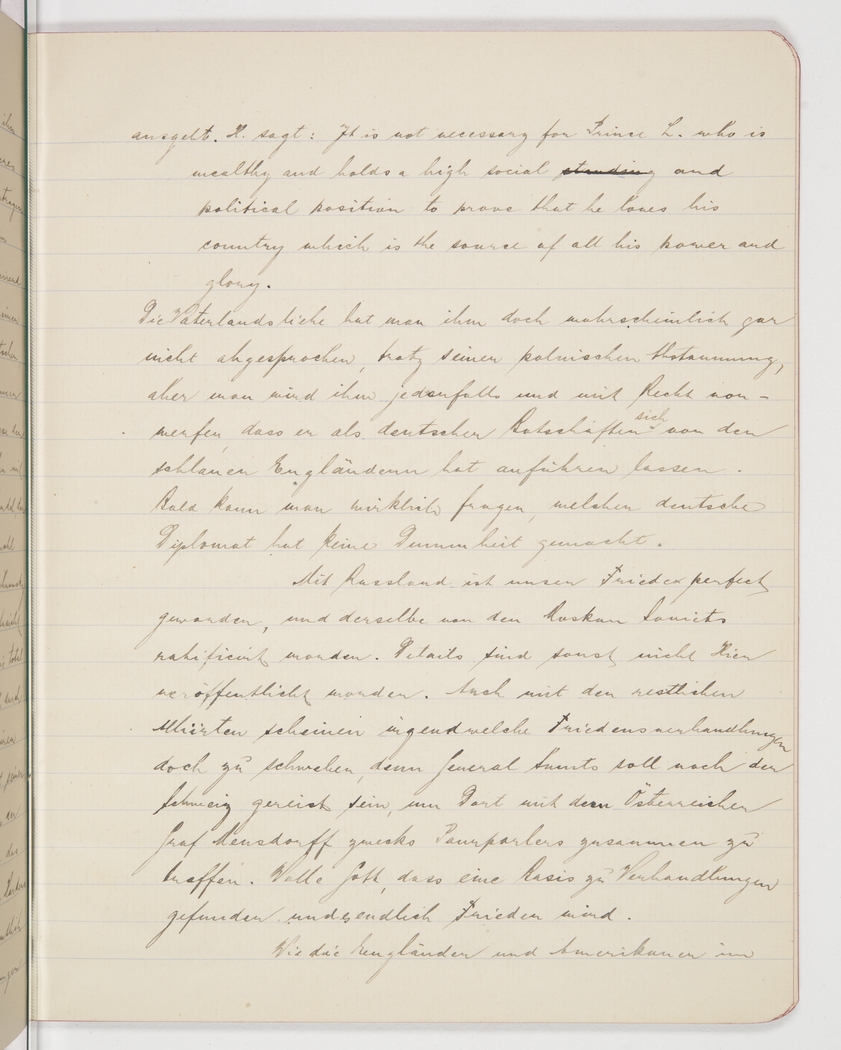 <p>[Page 72]</p><p>premise. H. says: [original English quote]</p><p>It is not necessary for Prince L. who is wealthy and holds a high social standing and political position to prove he loves his country which is the source of all his power and glory. [end English quote]</p><p>They probably don&#39;t doubt his love of the country, despite his Polish lineage, but they rightfully blame him, as the German ambassador, for letting the cunning English pull one over him. Shortly we may have to ask if there is any German diplomat left who hasn&#39;t behaved stupidly. Our peace with Russia is a done deal, already ratified by the Moscow Soviets. Details have not been published here.</p><p>Some sort of peace negotiations with the other Allies seem to be in the air as well, since General Smuts is reported to have travelled to Switzerland to meet the Austrian Count Mensdorff for talks. Let&#39;s pray that they find a basis for negotiations and that there will be peace at last. How the English and Americans treat</p>