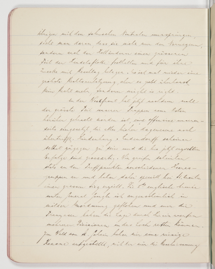 <p>[Page 73]</p><p>the weak neutral nations, by the way, can be seen from the fact that they took hold of a large part of the Norwegian and Dutch merchant fleets to use for their own purposes. It's another crass violation of rights, but there are no rights anymore, it's now all "might is right".</p><p>On the western front, where by now most of our troops from the east would have gathered, we have begun an offensive that surpasses all previous endeavours. Hindenburg and Ludendorff are both present, and the success so far is remarkable. We seem to focus our attacks on the meeting points of various troops and have thus achieved a great victory in St Quentin, for example. The British 5th Army under General Gough is said to have fled in total disorder and the French could salvage the situation only by throwing several divisions into the gap. We have installed a giant cannon in the Forest of St Gobain and</p>