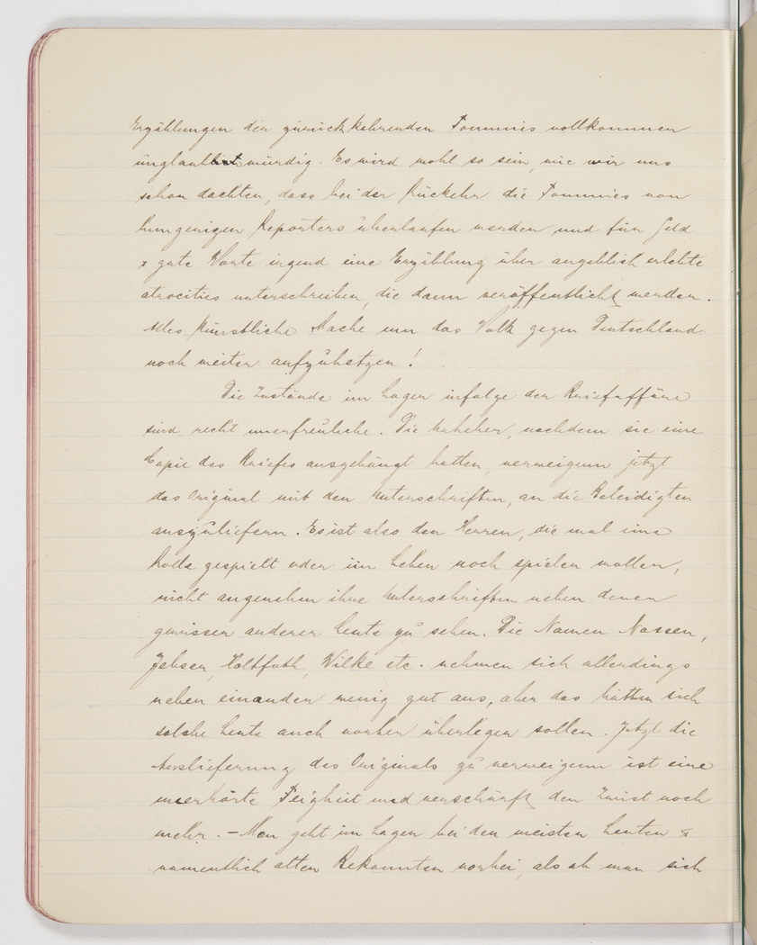 <p>[Page 75]</p><p>the tales of the returning Tommies were utterly untrustworthy. It will be as we always suspected: the Tommies returning from the front are besieged by hungry reporters and will, for a few shillings or a good word, embellish their reports with a few atrocities they claim to have witnessed, and it all gets published. Nothing but fabrications to stoke the anti-German sentiment!</p><p>The mood in camp after the letter affair is rather bad. The initiators of the letter, after posting a copy on the noticeboard, now refuse to hand over the original with the signatures. It seems the gentlemen who have once played a role in camp, or would like to play a role in society one day, don't feel comfortable with their signatures sitting next to those of certain other people. Indeed, the names Nasser, Jehsen, Holtfuth, Wilke etc don't look so good next to each other, but these people should have considered this beforehand.</p>