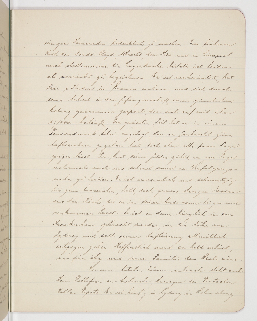<p>[Page 82]</p><p>its mark on some comrades. A former cook for Norddeutsche Lloyd, Albrecht, who at times managed the camp kitchen here and in Liverpool, has to be declared mad, I'm afraid. He is married, has a wife and children in Bremen, and by working during captivity has saved up a substantial amount, far exceeding 1000 Mark. He has invested most of the money in a 1000-Mark note that he asked Gerbrecht to keep in trust but which he wants to see every other day. He counts the rest of his money several times a day, so he seems to be suffering from a persecution complex. He is very untidy and extremely grotty, fetches huge amounts of food from the kitchen which he then lets rot away in his cell. He was recently brought to a hospital near Sydney and will hopefully be released and sent home fairly soon, which would be the best for him and his family.</p><p>Mr Detlefsen from Colombo, manager of the German Coal Deposit, is nearing a total collapse as well. He is often being treated in Sydney</p>