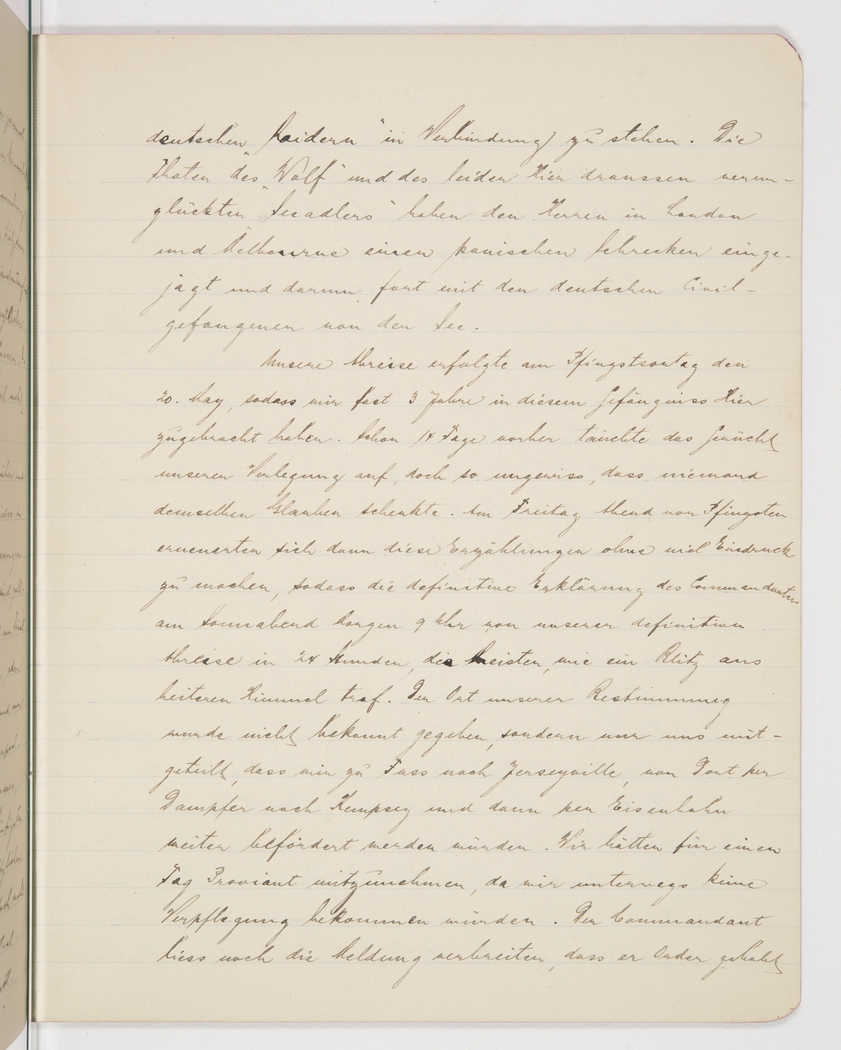 <p>[Page 84]</p><p>German &quot;raiders&quot;. The deeds of the &quot;Wolf&quot; and the &quot;Seeadler&quot; [Sea Eagle], which unfortunately perished here have given the gentlemen in London and Melbourne a hellish fright and thus, keep the German civilian prisoners away from the sea.</p><p>Our departure came on Whitsunday, 20 March, which means we spent almost 3 years in that gaol. The first rumour of a transfer emerged 14 days earlier, but was so vague that nobody put any stock in it. Even when the rumours re-emerged on Friday before Whitsunday, they didn&#39;t concern us much, and so when the Commander told us on Saturday morning 9 am that we would be leaving in 24 hours, it hit most of us like a thunderbolt. The destination was not disclosed, we were merely told that we would be going on foot to Jerseyville, from there via steamer to Kempsey and then onward by train. We were to take along a day&#39;s worth of food supplies since there would be no meals during the journey. The Commander also let it be known that he had received orders</p>