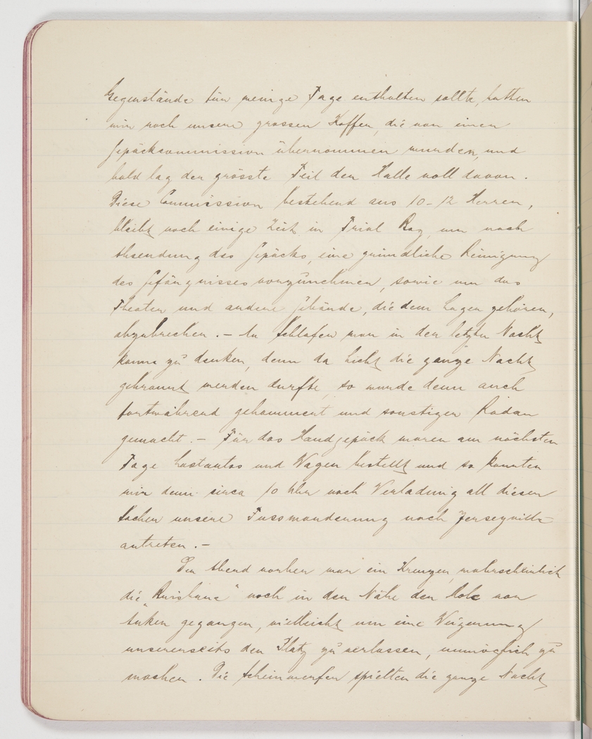 <p>[Page 87]</p><p>would do us for a few days, we had our big trunks, which were to be handled by a luggage commission, and soon most of the big hall was full of them. This commission, comprising 10-12 men, would remain in Trial Bay for a while longer to see to the shipment of the large luggage, to undertake a thorough cleaning of the gaol, and to dismantle the theatre and other camp-specific installations. There was no chance of sleep that last night because the lights were kept on right through and there was constant hammering and other noise. The next day we loaded our hand luggage onto trucks and carts and began our march to Jerseyville about 10 am.</p><p>The evening before, a cruiser, most likely the "Brisbane", had dropped anchor near the pier, maybe to intervene should we resist departure. The high beams were active all night,</p>