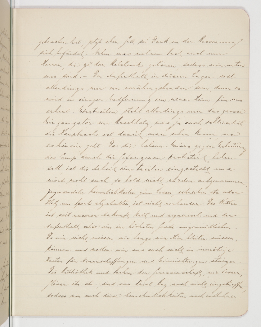 <p>[Page 94]</p><p>departure but fortunately is doing a lot better already. Next to us are mostly men who belong to the Bolsheviks so that we are among ourselves. Reportedly, we are to stay in this camp only temporarily since they are building a new home at some distance. So far they have erected just the main door, made from bush wood, which of course is the main thing if you want to know where to enter. Because the labour unions have protested against prisoners building the camp, work has been stopped and will probably not be resumed in the foreseeable future. There is no suitable room for reading or writing or space for sport activities. And the weather has been cold and rainy since we arrived, so it's anything but comfortable here. Because we don't know how long we will stay here, there's no point in spending money on furnishings or facilities. The library and stuff from the cooperative, like cups, glasses, etc, etc, have not arrived yet from Trial Bay, so we are lacking those amenities as well.</p>