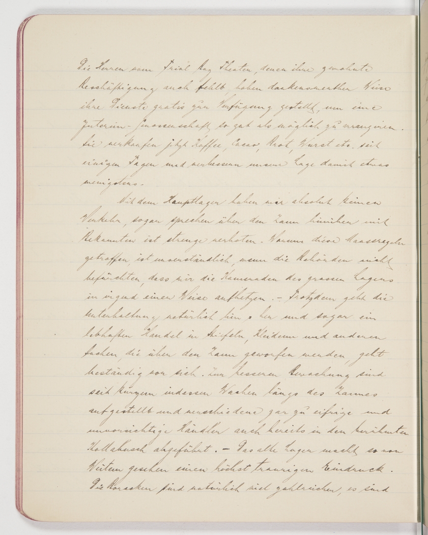 <p>[Page 95]</p><p>The gentlemen from the Trial Bay theatre, who are missing their hobby, too, have offered their services free of charge to organise an interim cooperative and are now selling coffee, cocoa, bread, sausages, etc, etc, which alleviates the situation a little bit.</p><p>We have absolutely no contact with the main camp and even communication across the fence is strictly forbidden. Why the authorities have issued this order is not clear, lest they fear that we'd be stirring the masses. But conversations are happening anyway, and even a lively trade has sprung up, with boots, clothes and other things being thrown over the fence. But they have now posted more guards along the fence and several overly eager traders have ended up in the famous Kallabusch. The old camp, seen from a distance, looks dismal. There are, of course, a lot more barracks, which</p>