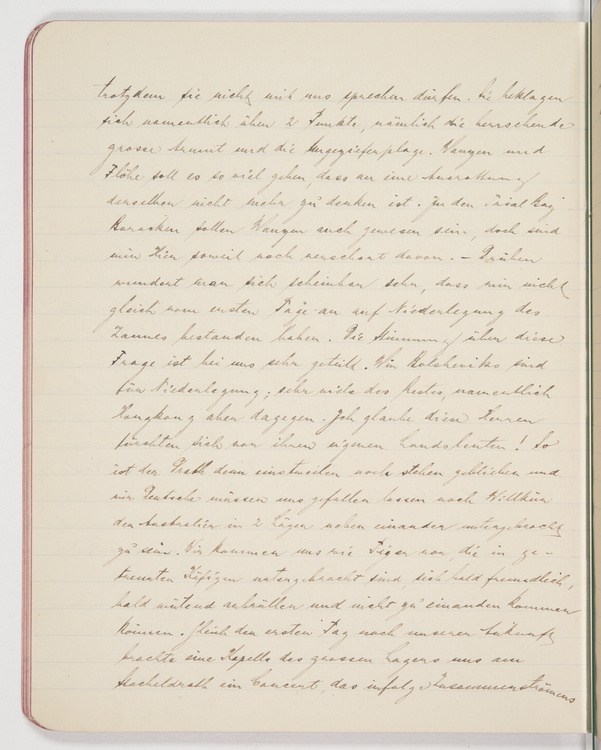 <p>[Page 97]</p><p>even though they are not supposed to talk to us. They complain mainly of 2 things: the widespread poverty and the vermin. They say there are so many bugs and fleas that they no longer have a chance of exterminating them. In the Trial Bay barracks we also had the occasional bug, but here we have been spared so far. In the main camp, apparently, they wonder why we did not insist on removal of the fence from day one. We here are rather divided on this issue. We Bolsheviks are in favour of a removal, but a lot of the others, particularly those from Hong Kong, are totally opposed. I think those gentlemen are afraid of their own countrymen! Thus, the fence remains for now, and we Germans have to tolerate the Australian arbitrariness of keeping us in 2 separate camps. We feel a bit like tigers who are kept in different cages and who half purr, half roar at each other and can never get close. On the very first day after our arrival, the orchestra of the main camp serenaded us across the fence, but because the concert attracted</p>