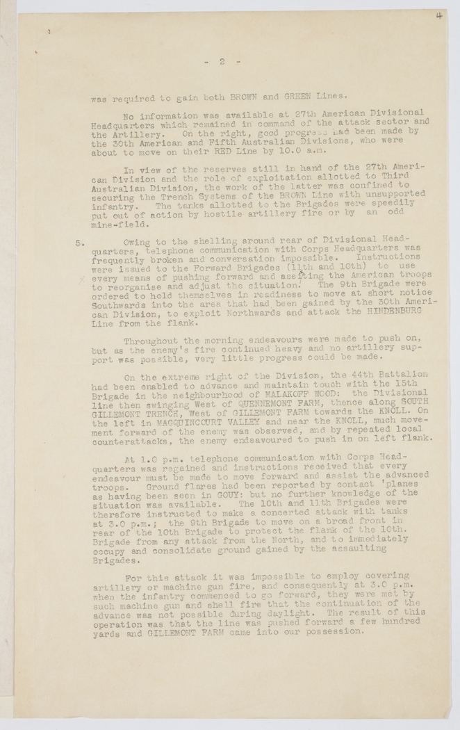 5. Owing to shelling around rear of Divisional Headquarters, telephone communication with Corp Headquarters was frequently broken and conversation impossible. Instructions were issued to the forward Brigades (11th and 10th) to use every means of pushing forward and assisting the American troops to reorganise and adjust to the situation. The 9th Brigade were ordered to hold themselves in readiness to move at short notice Southwards into the area that had been gained by the 30th American Division, to exploit Northwards and attack the HINDENBURG Line from the flank.