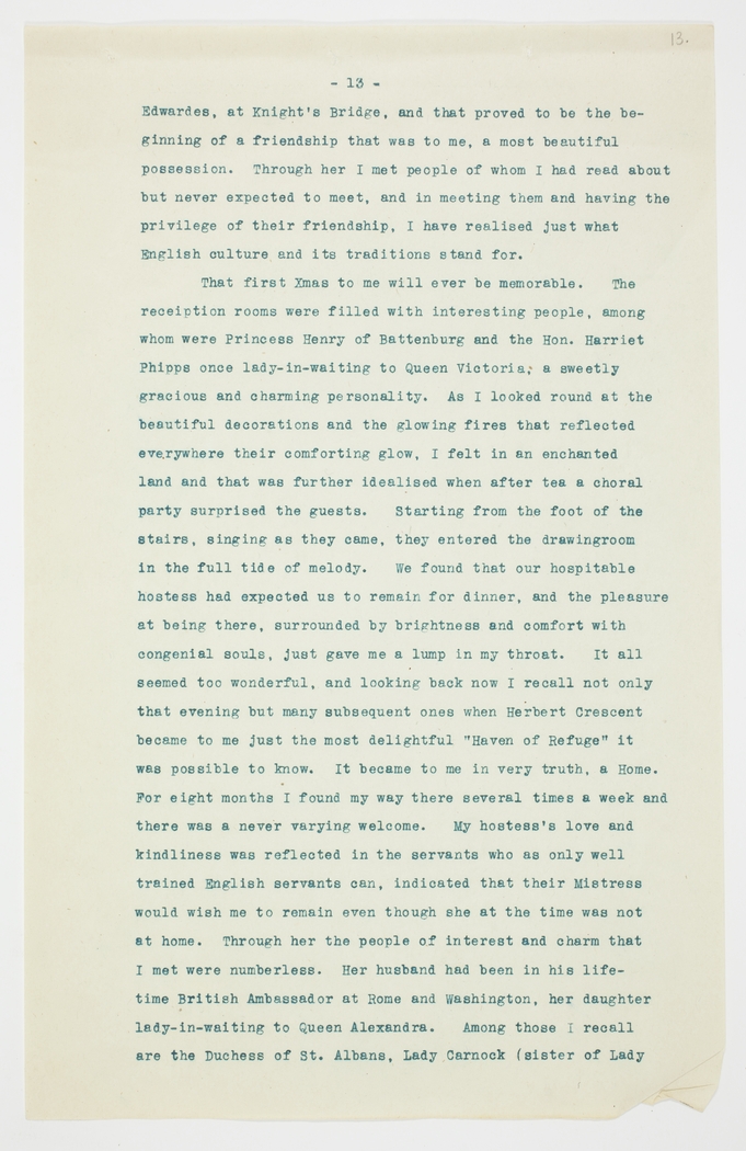 That first Xmas to me will ever be memorable. The receiption rooms were filled with interesting people, among whom were Princess Henry of Battenburg and the Hon. Harriet Phipps once lady-in-waiting to Queen Victoria, a sweetly gracious and charming personality. As I looked round at the beautiful decorations and the glowing fires that reflected everywhere their comforting glow, I felt in an enchanted land and that was further idealised when after tea a choral party surprised the guests. Starting from the foot of the stairs, singing as they came, they entered the drawingroom in the full tide of melody. We found that our hospitable hostess had expected us to remain for dinner, and the pleasure at being there, surrounded by brightness and comfort with congenial souls, just gave me a lump in my throat. It all seemed too wonderful, and looking back now I recall not only that evening but many subsequent ones when Herbert Crescent became to me just the most delightful "Haven of Refuge" it was possible to know. It became to me in very truth, a Home. For eight months I found my way there several times a week and there was a never varying welcome. My hostess's love and kindliness was reflected in the servants who as only well trained English servants can, indicated that their Mistress would wish me to remain even though she at the time was not at home. Through her the people of interest and charm that I met were numberless. Her husband had been in his life-time British Ambassador at Rome and Washington, her daughter lady-in-waiting to Queen Alexandra. Among those I recall are the Duchess of St. Albans, Lady Carnock (sister of Lady