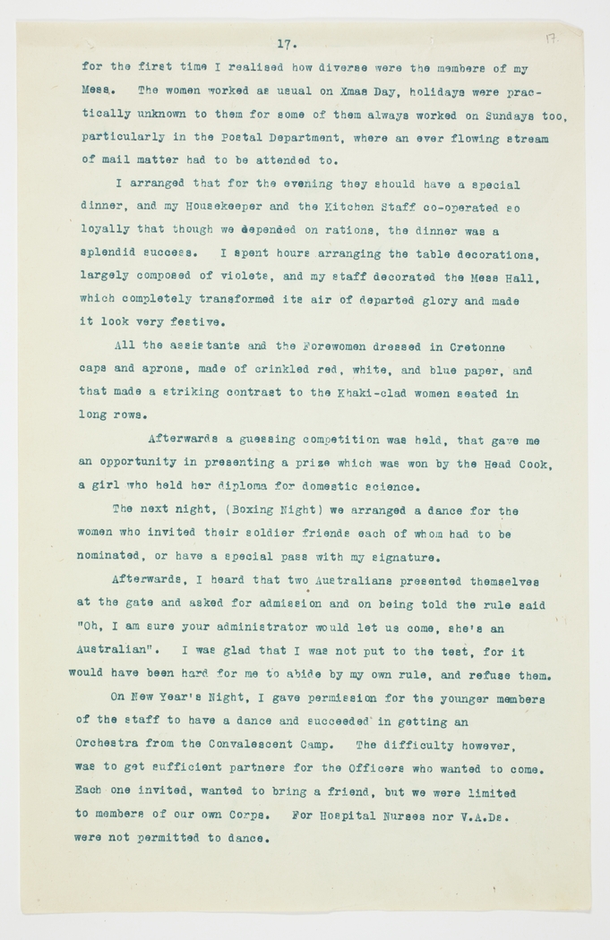 for the first time I realised how diverse were the members of my Mess.  The women worked as usual on Xmas Day, holidays were practically unknown to them for some of them always worked on Sundays too, particularly in the Postal Department, where an ever flowing stream of mail matter had to be attended to.