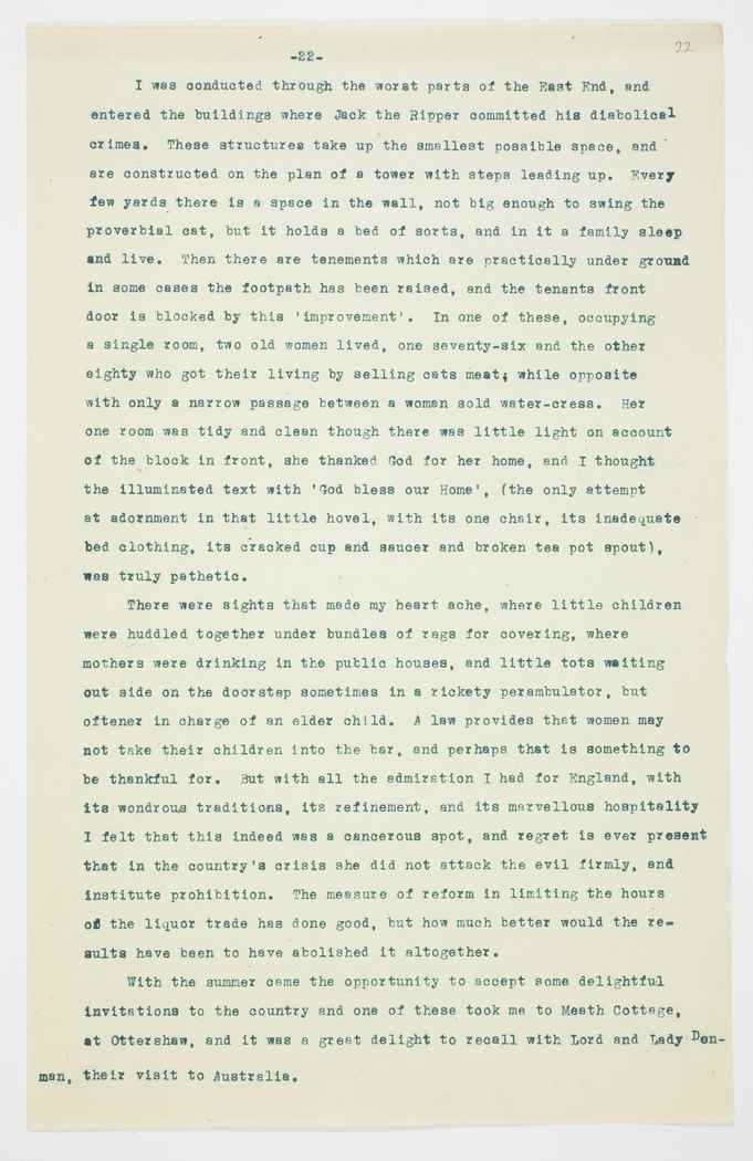 I was conducted through the worst parts of the East End, and entered the buildings where Jack the Ripper committed his diabolical crimes. These structures take up the smallest possible space, and are constructed on the plan of a tower with steps leading up. Every few yards there is a space in the wall, not big enough to swing the proverbial cat, but it holds a bed of sorts, and in it a family sleep and live. Then there are tenements which are practically under ground in some cases the footpath has been raised, and the tenants front door is blocked by this 'improvement'. In one of these, occupying a single room, two old women lived, one seventy-six and the other eighty who got their living by selling cats meat, while opposite with only a narrow passage between a woman sold water-cress. Her one room was tidy and clean though there was little light on account of the block in front, she thanked God for her home, and I thought the illuminated text with 'God bess our Home', (the only attempt at adornment in that little hovel, with its one chair, its inadequate bed clothing, its cracked cup and saucer and broken tea pot spout), was truly pathetic.