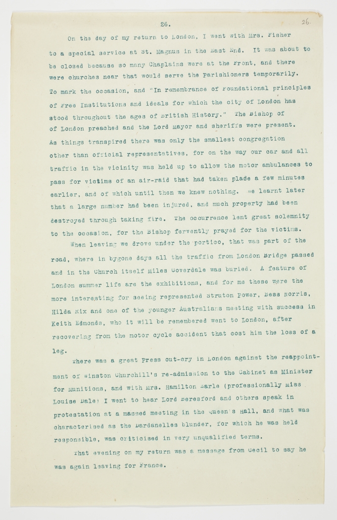 On the day of my return to London, I went with Mrs. Fisher to a special service at St. Magnus in the East End. It was about to be closed because so many Chaplains were at the Front, and there were churches near that would serve the Parishioners temporarily. To mark the occasion, and "In remembrance of Foundational principles of Free Institutions and ideals for which the city of London has stood throughout the ages of British History." The Bishop of London preached and the Lord Mayor and sheriffs were present. As things transpired there was only the smallest congregation other than official representatives, for on the way our car and all traffic in the vicinity was held up to allow the motor ambulances to pass for victims of an air-raid that had taken place a few minutes earlier, and of which until then we knew nothing. We learnt later that a large number had been injured, and much property had been destroyed through taking fire. The occurrence lent great solemnity to the occasion, for the Bishop fervently prayed for the victims.