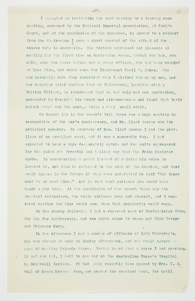 I accepted an invitation the next evening to a drawing room meeting, convened by the National Imperial Association, at Earl's Court, and at the conclusion of the speeches, in answer to a request from the Chairwoman I gave a short account of the effect of the womans vote in Australia. The Hostess expressed her pleasure at meeting for the first time an Australian woman, though she has, she said, some two years before met a young officer, who had been wounded at Lone Pine, and whose name was Lieutenant Cecil H. James. She was naturally more than surprised when I claimed him as my son, and her daughter added further that at Folkestone, lunching with a British Officer, he remembered that he had only met one Australian, proceeded to describe his wound and circumstances and found that their mutual 'one' was the same - truly a very small world.