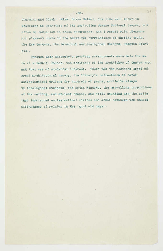 charming and ideal. Miss. Grace Watson, one time well known in Melbourne as Secretary of the Australian Womens National League, was often my companion on these excursions, and I recall with pleasure our pleasant chats in the beautiful surroundings of Chorley Woods, the Kew Gardens, the Botanical and Zoological Gardens, Hampton Court etc.