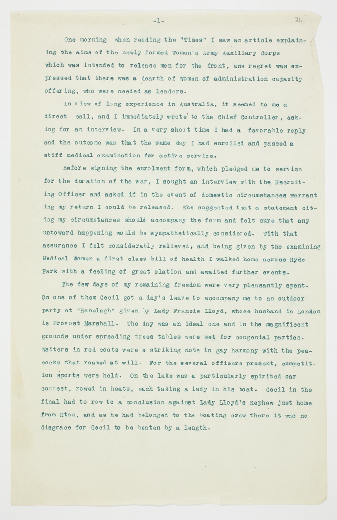 One morning when reading the "Times" I saw an article explaining the aims of the newly formed Women's Army Auxiliary Corps which was intended to release men for the front, and regret was expressed that there was a dearth of Women of administration capacity offering, who were needed as leaders.