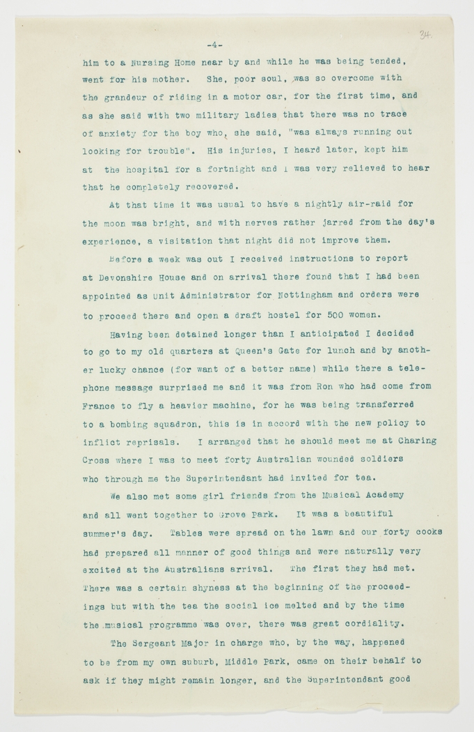 Having been detained longer than I anticipated I decided to go to my old quarters at Queen's Gate for lunch and by another lucky chance (for want of a better name) while there a telephone message surprised me and it was from Ron who had come from France to fly a heavier machine, for he was being transferred to a bombing squadron, this is in accord with the new policy to inflict reprisals. I arranged that he should meet me at Charing Cross where I was to meet forty Australian wounded soldiers who through me the Superintendant had invited for tea.