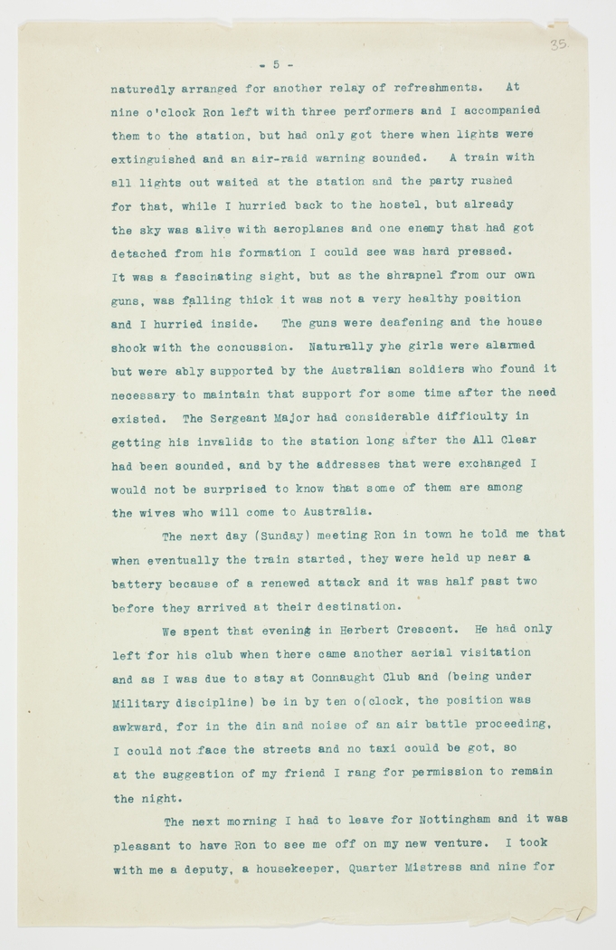 naturedly arranged for another relay of refreshment. At nine o'clock Ron left with three performers and I accompanied them to the station, but had only got there when lights were extinguished and an air-raid warning sounded. A train with all lights out waited at the station and the party rushed for that, while I hurried back to the hostel, but already the sky was alive with aeroplanes and one enemy that had got detached from his formation I could see was hard pressed. It was a fascinating sight, but as the shrapnel from our own guns, was falling thick it was not a very healthy position and I hurried inside. The guns were deafening and the house shook with the concussion. Naturally the girls were alarmed but were ably supported by the Australian soldiers who found it necessary to maintain that support for some time after the need existed. The Sergeant Major had considerable difficulty in getting his invalids to the station long after the All Clear had been sounded, and by the addresses that were exchanged I would not be surprised to know that some of them are among the wives who will come to Australia.