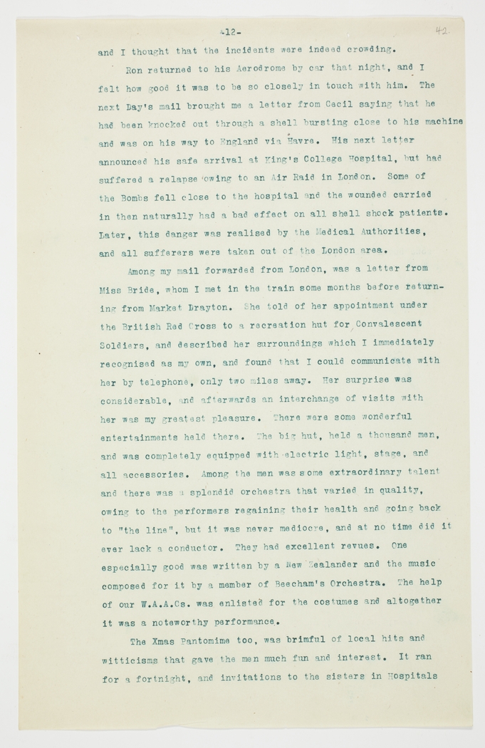 Among my mail forwarded from London, was a letter from Miss Bride, whom I met in the train some months before returning from Market Drayton. She told of her appointment under the British Red Cross to a recreation hut for Convalescent Soldiers, and described her surroundings which I immediately recognised as my own, and found that I could communicate with her by telephone, only two miles away. Her surprise was considerable, and afterwards an interchange of visits with her was my greatest pleasure. There were some wonderful entertainments held there. The big hut held a thousand men, and was completely equipped with electric light, stage, and all accessories. Among the men was some extraordinary talent and there was a splendid orchestra that varied in quality, owing to the performers regaining their health and going back to "the line", but it was never mediocre, and at no time did it ever lack a conductor. They had excellent revues. One especially good was written by a New Zealander and the music composed for it by a member of Beecham's Orchestra. The help of our W.A.A.Cs. was enlisted for the costumes and altogether it was a noteworthy performance.