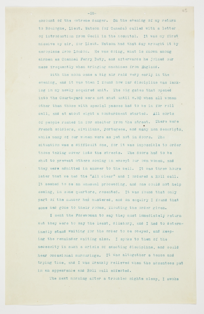 With the moon came a big air raid very early in the evening, and it was then I found how far discipline was lacking in my newly acquired unit. The big gates that opened into the Court-yard were not shut until 8.30 when all women other than those with special passes had to be in for roll call, and at about eight a bombardment started. All sorts of people rushed in for shelter from the street. There were French soldiers, civilians, Portugese, and many non descripts, while many of our women were as yet not in doors. The situation was a difficult one, for it was impossible to order those taking cover into the streets. The doors had to be shut to prevent others coming in except our own women, and they were admitted in answer to the bell. It was three hours later that we had the "All clear" and I ordered a Roll call. It seemed to be an unusual proceeding, and one could not help seeing, in some quarters, resented. It was found that only part of the number had mustered, and on enquiry I found that some had gone to their rooms, flouting the order given.